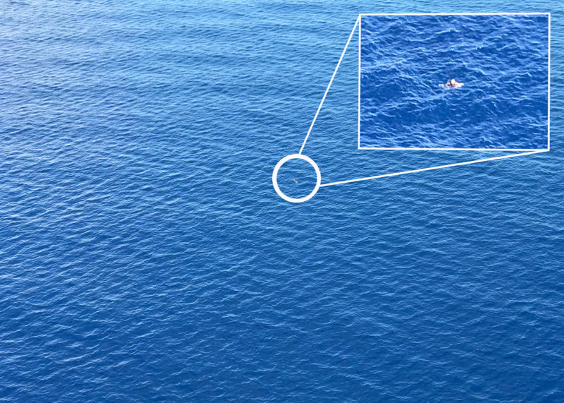Вахтенные береговой охраны Майами сделали срочное оповещение, после которого спасатели на лодках и вертолете начали поиски. Моряка обнаружили в воде и направили лодку к месту происшествия. На фото не совсем четко видно, держался ли моряк на плаву благодаря спасательному средству. После спасения ему предоставили медицинскую помощь.