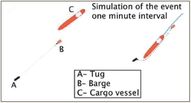 Универсальное грузовое судно следовало ночью по системе разделения движения со скоростью 15 узлов. Трафик был загруженный, а на мостике находился только вахтенный помощник. Судно приближалось к буксиру, которое буксировало самоходный плавучий кран примерно в 6 милях впереди. Буксир и буксируемое судно следовали со скоростью 6 узлов, придерживаясь северной оконечности полосы движения, для того чтобы дать другим судам возможность обойти их по левому борту. Длина буксирного троса была 250 м.