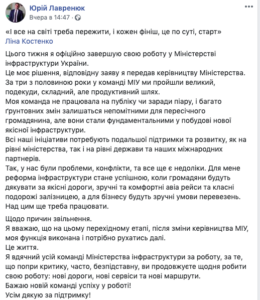 Заместитель министра инфраструктуры Юрий Лавренюк подал в отставку в связи со сменой руководства. Об этом он написал вчера на своей странице в Facebook.