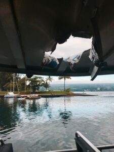 Во время извержения вулкана Килауэа на Гавайях части раскаленной лавы упали на крышу лодки и попали в пассажирское отделение.