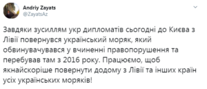 Вчера в Украину вернулся украинский моряк, которого удерживали около трех лет в Ливии из-за обвинений в совершении правонарушения. Об этом сообщает государственный секретарь МИД Украины Андрей Заяц в своем Twitter.