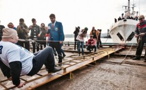 В Черноморске, на причале Ильичевского судоремонтного завода украинский силач Олег Скавыш (известен также как Тягнизуб) протянул по воде зубами судно весом 614 тонн.