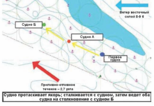 Вскоре скорость судна увеличилась до 0,9 узлов, продолжая протаскивать якорь по направлению к судну А. Вахтенный помощник на судне А связался с первым судном и отдал приказ подготовить главный двигатель, предупредив капитана о сложившейся ситуации. Прежде чем экипаж успел что-то предпринять, судно, протаскиваемое на якоре, столкнулось кормой с носом судна А. В результате пароход потерял способность маневрировать, потому что его корма зацепилась за якорную цепь судна А.